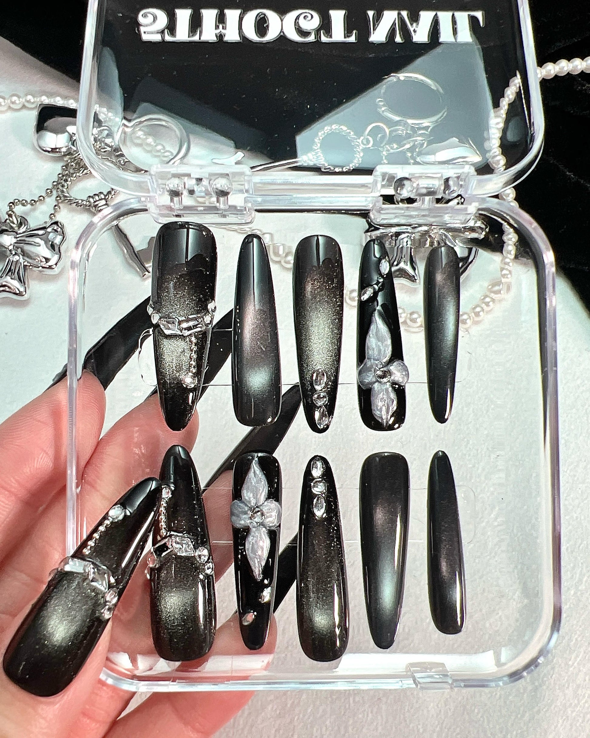Black Whisper press-on nails feature an extra-long Stiletto shape with a striking black cat-eye finish enhanced by intricate hand-carved detailing.