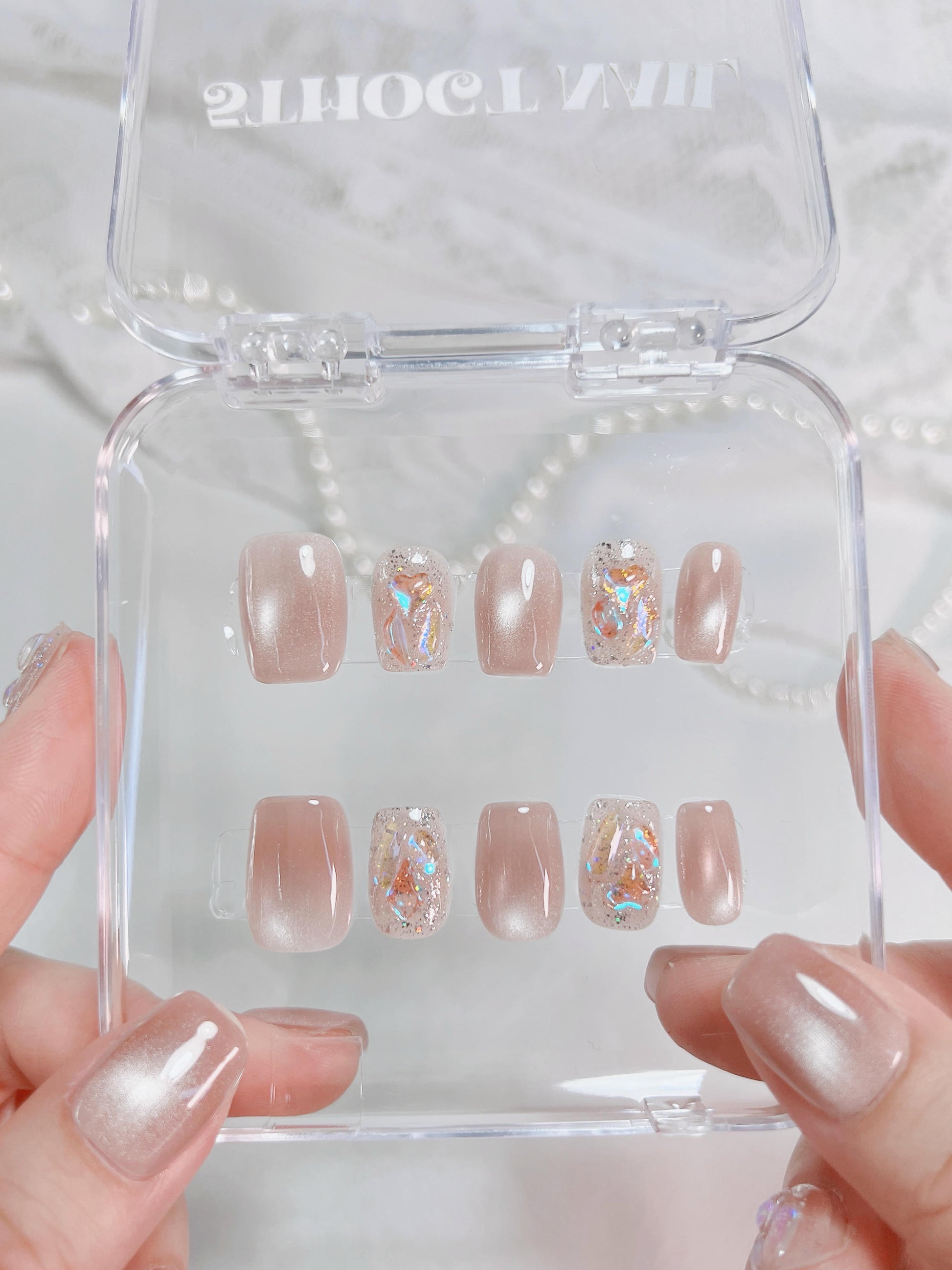 Calm: the ultimate everyday essential. These ultra-short tapered nails feature a sophisticated nude cat-eye finish that shifts subtly with light, delivering understated elegance without compromise. Perfect for those who value refined style in their daily routine.