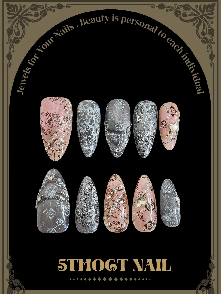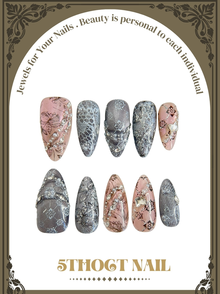 Elegance: Medium almond nails with a mesmerizing soft pink and grey cat-eye finish. Delicate lace detailing and pearl-zirconia accents create an effortlessly elegant look that works for any occasion.