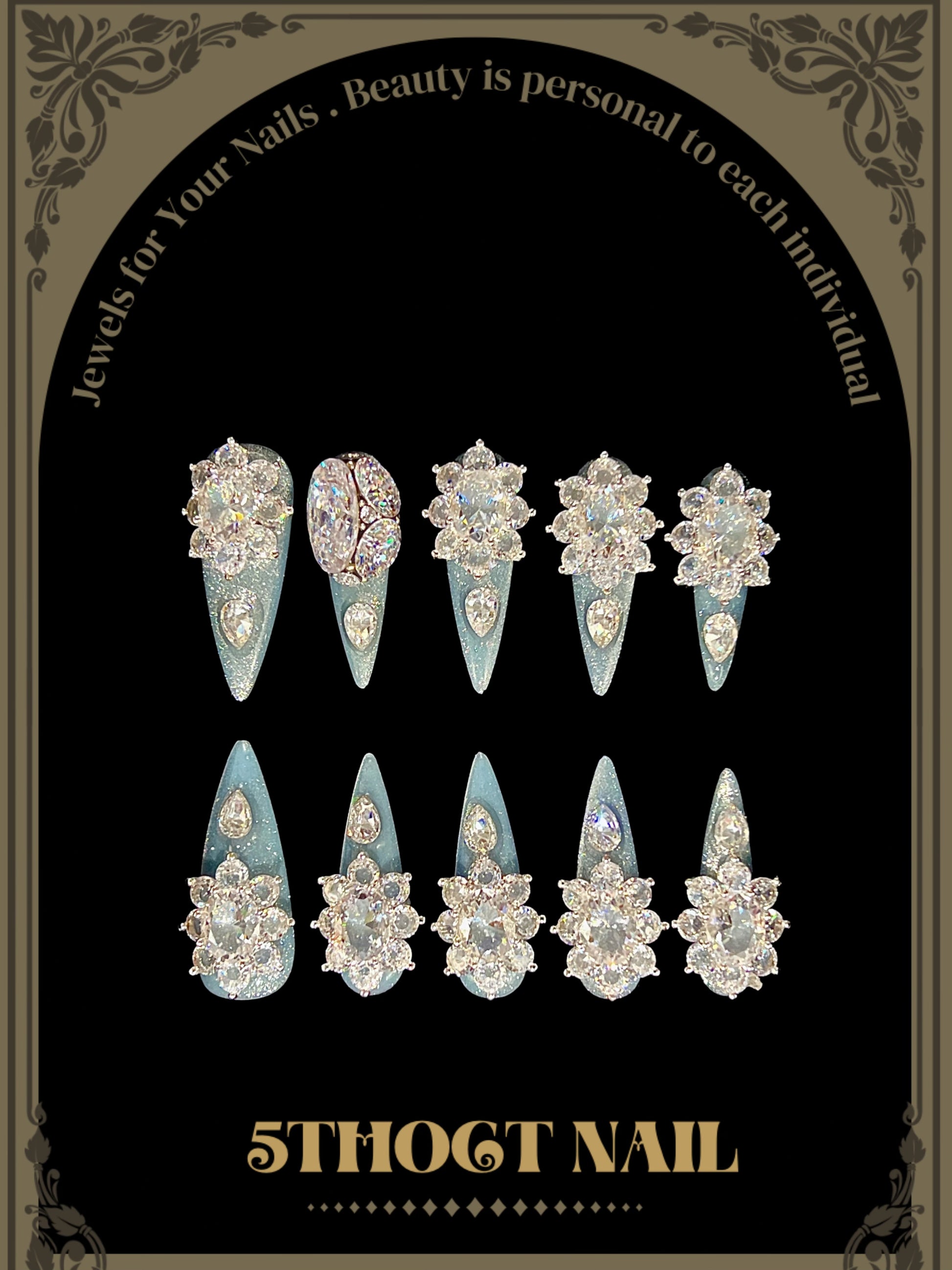 Oceanus’ Heart features a long-stiletto shape with a glacier blue cat eye base that shimmers elegantly. Adorned with high-quality zirconia stones and a distinctive zirconia sphere, this manicure exudes purity and clarity. Perfect for discerning enthusiasts, it offers a refined look that pairs beautifully with fine jewelry, making it a treasure worth preserving.
