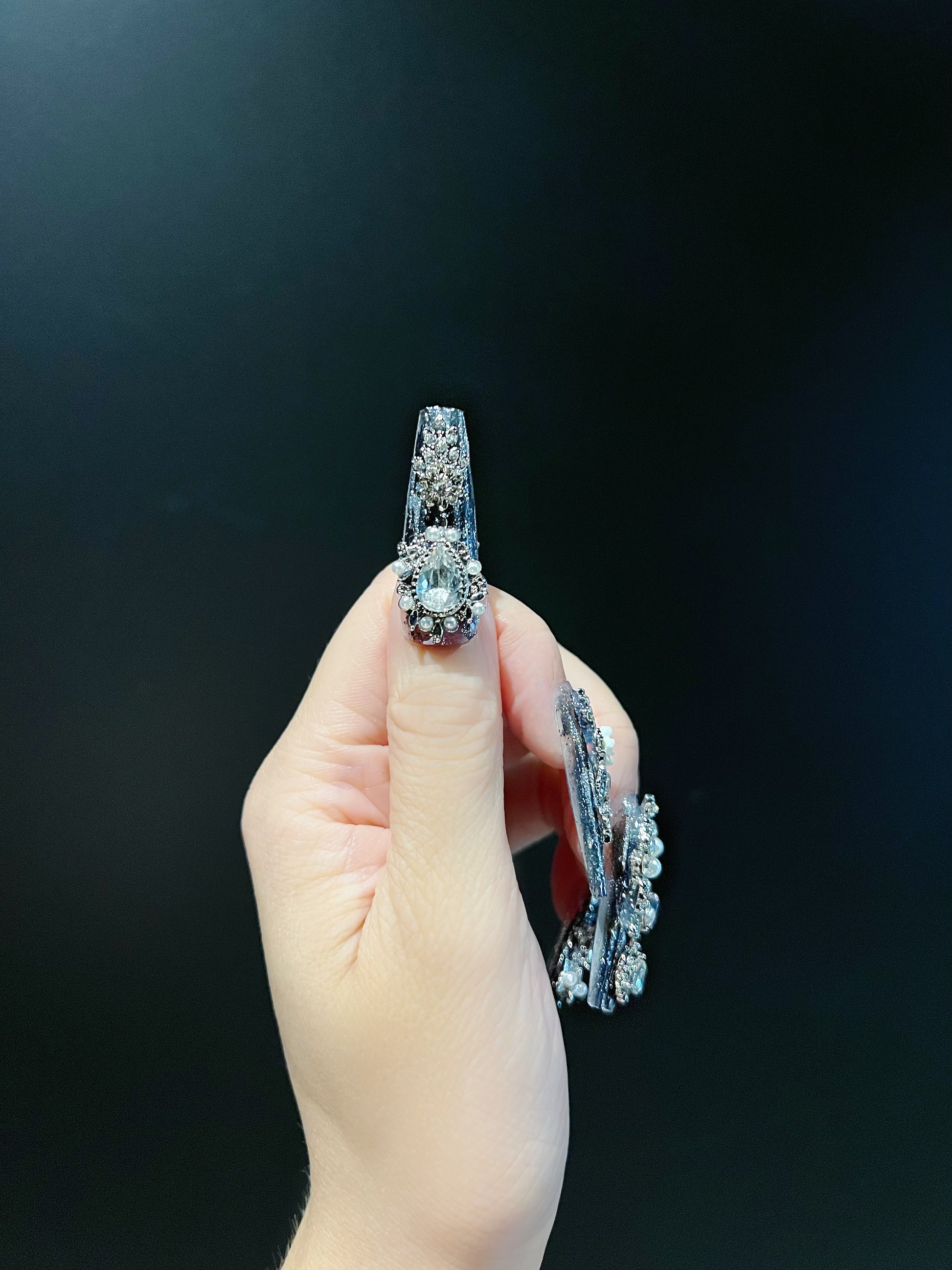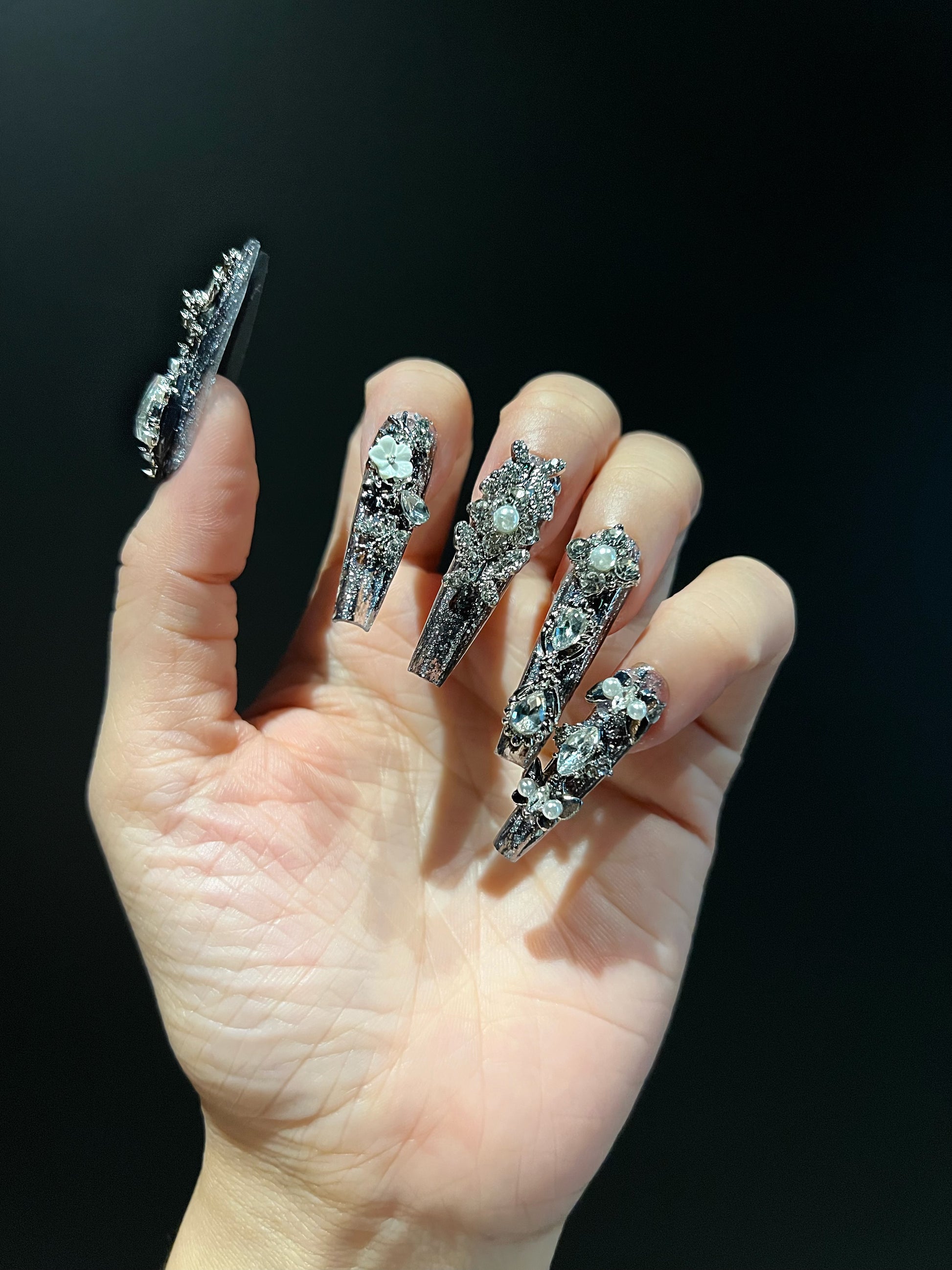 Obscura-Maximalism nails command attention with an intricate, maximalist design that celebrates bold artistry. Featuring a long-coffin shape and ornate metallic alloy accents.