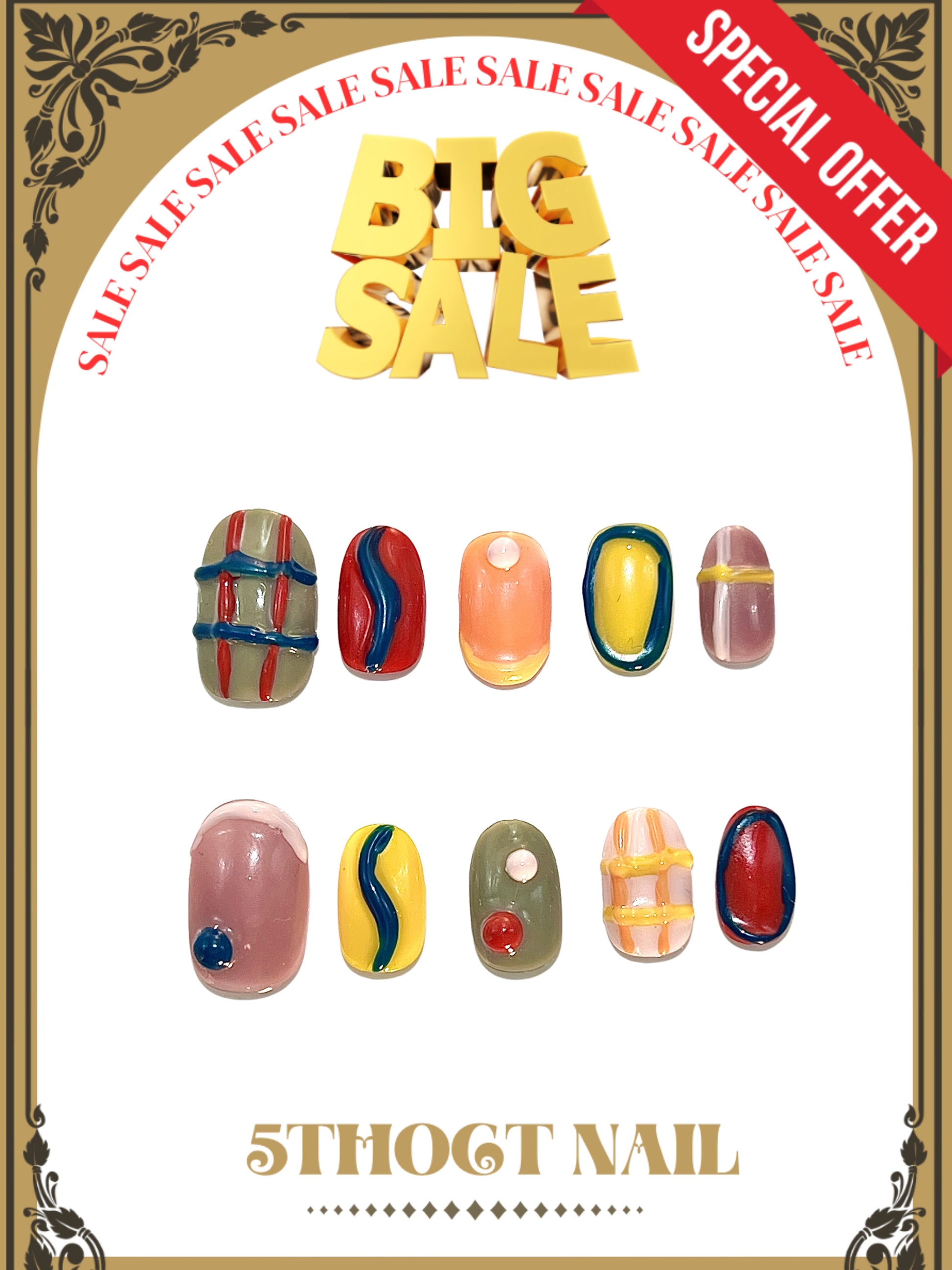 Palette Play offers a playful and charming take on short, rounded press-on nails with a Thai-inspired design. Featuring vibrant color palettes outlined by textured lines and polka dots, these nails bring a unique artistic flair to everyday looks. Ideal for those who appreciate colorful, eye-catching accessories that elevate daily style with creativity and fun.