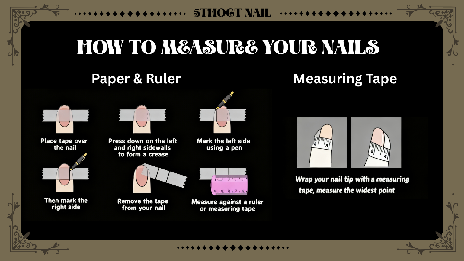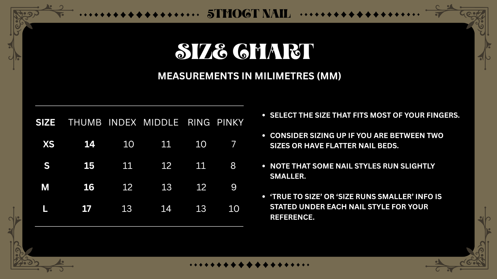 A SIZE CHART IS AVAILABLE ONLINE, ALONG WITH INSTRUCTIONS ON HOW TO MEASURE NAILS CORRECTLY.